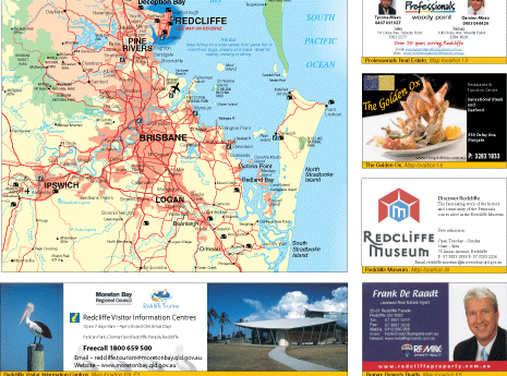 Redcliffe City Council wanted a map that they could give away to visitors. It's a double sided map where a detailed street map is on one side and the map on the other side is of the region and is surrounded by advertisements from local businesses who pay to advertise. The map is reprinted every year and has been taken up by the now merged Moreton Bay Regional Council.