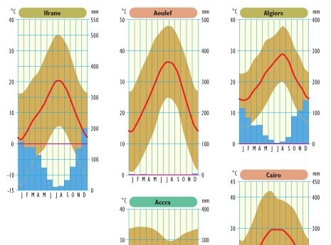 Statistics can be graphed in many ways. One standard geographical data set is that of climate statistics for a particular location which are graphed in a climate graph showing monthly changes in temperature and rainfall.