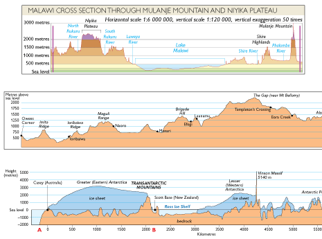 Geographic cross sections provide users with an imaginary view of a vertical cross section through some part of the earth - these three show Malawi, the Kokada Track and Antarctica.