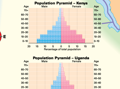 Another standard geographical graph is the population pyramid which shows the proportion of the total population within an age range by gender.