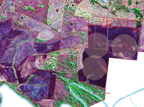 Maps of smaller properties can show tree lines and improved pastures. Any of these maps can also be supplied as geo-referenced PDF files and then viewed on an iOS device such as an iPod Touch, iPhone or iPad through the free Avenza PDF maps app. Once the PDF is loaded into the device it can pinpoint the user's location on the map. Users can add waypoints and measure distances and areas. See the video for a demonstration. Once the free app is installed you can trial it with a free simple map of Queensland found here