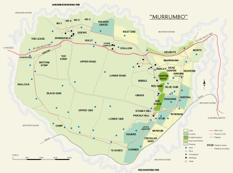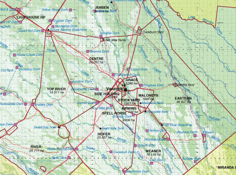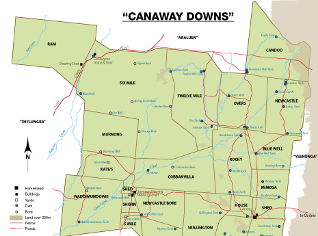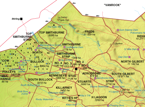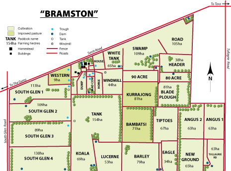 Property maps can be used for property management or as a sales tool. They would normally show paddocks with fence lines, watering points, paddock names and areas, creeks, property tracks, homesteads and buildings. They can also show areas of high ground or heavy vegetation.