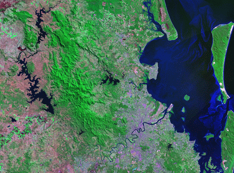 There are numerous satellites in orbit around Earth that capture images of different parts of the planet at different resolutions and at different time intervals. This is a Landsat image of the greater Brisbane area. Landsat images are available for the whole world.