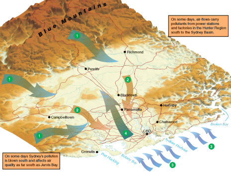 This image shows an oblique view of a DEM of the greater Sydney basin showing airflows that lead to air pollution in the city.